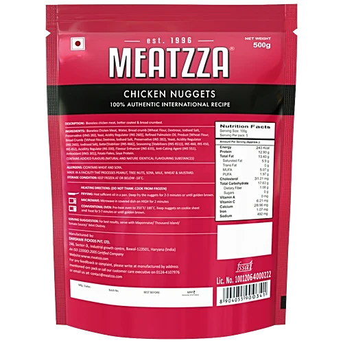 The Meatzza Chicken Nuggets are a frozen, ready-to-cook snack or meal item made from boneless chicken meat. They feature a crispy breadcrumb coating and are manufactured by Darshan Foods Private Limited in India.
