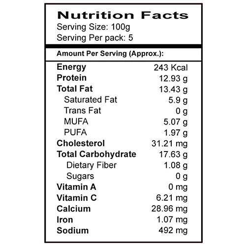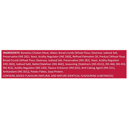 • Ingredients: Boneless chicken meat, water, breadcrumbs, preservatives, yeast, acidity regulators, refined palmolein oil, and seasoning.