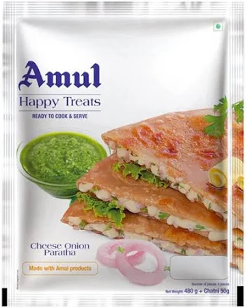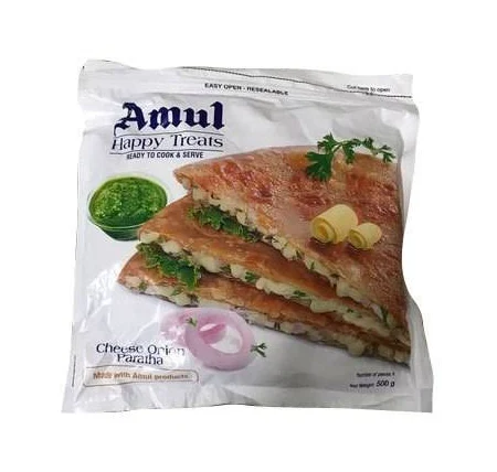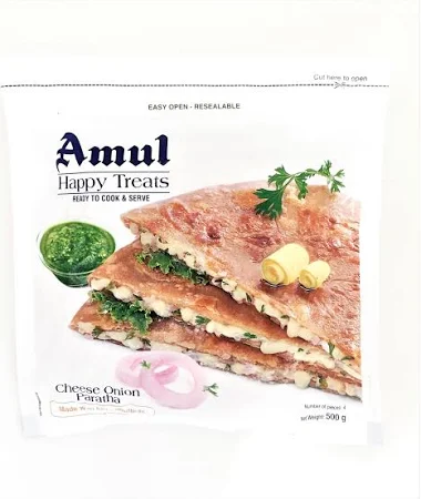 Amul Cheese Onion Paratha 500 g is prepared with original recipes from the traditional kitchens. Loved by all age groups, it can be eaten at any time of the day and can be enjoyed as a full meal for lunch or dinner. It is best served hot with a tasty Indian Curry or pickle and curd. These can go straight onto a pre-heated tawa or it can also be cooked in pre-heated oven.
