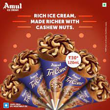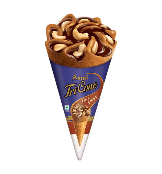 Indulge in a delightful dessert experience with Amul's Tricone Chocolate ice cream. Crafted with the finest natural ingredients, this delectable treat features a crispy wafer biscuit cone filled with rich, creamy chocolate ice cream. Topped with crunchy cashew nuts and a decadent chocolate sauce, it's a perfect blend of flavour and texture that will simply melt in your mouth