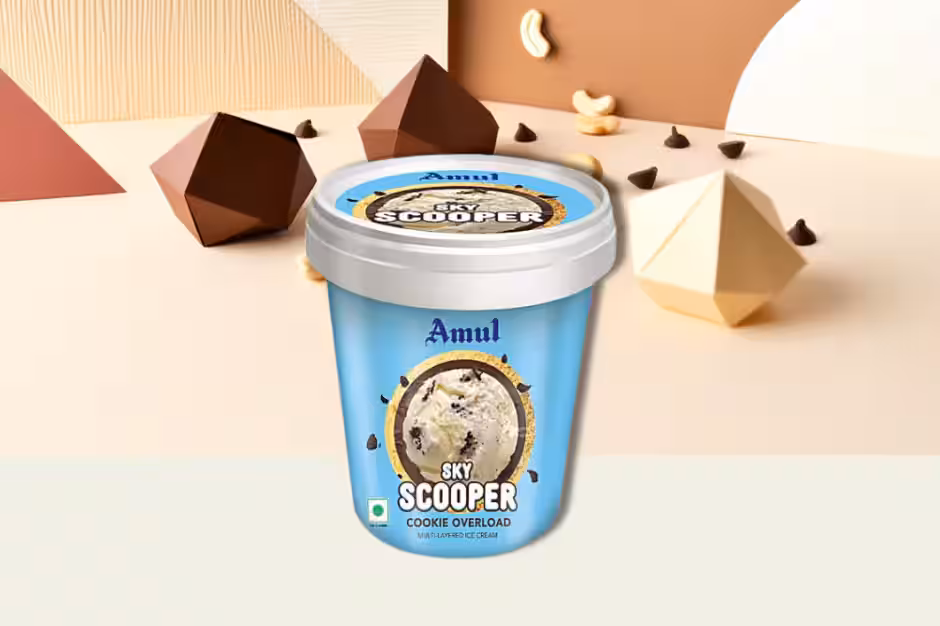 Amul Sky Scooper Cookie Overload is a multi-layered ice cream cup that offers a rich combination of textures and flavours. It features a base layer with cookie chunks, a creamy milk ice cream centre, and a topping of crushed cookies, delivering a satisfying cookie experience in every bite.