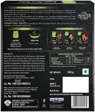 Veggie Pizza Pocket in a ready-to-cook pack. Recipe crafted by ITC Master Chefs. They are filled with classic pizza toppings. Contains cheese,capsicum,onion,sweet corn & oregano. You can deep fry or air-fry it. Made with the finest ingredients. Frozen with IQF (Individually Quick Frozen) technology. Try other Veg & Non-Veg snacks.