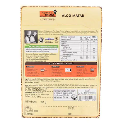 • Kitchens of India Aloo Matar is sterilised using retort process technology and packaged in a special 4-layer pouch that keeps the food fresh and retains its flavour and taste until consumption
