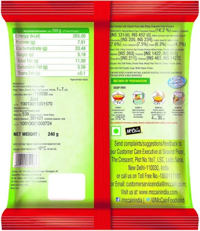 Nutritional Information (per 100 g of Frozen Product)* Energy (kcal) : 265 Protein (g) : 7.01 Carbohydrate (g) : 33.48 Sugar (g) : 5.19 Total Fat (g) : 11.5 Saturated Fat (g) : 5.56 Trans Fat (g) : <0.1 *Approximate Values
