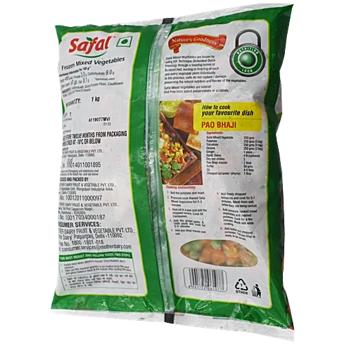 A packet of Safal Frozen Mixed Vegetables is what you need after a hard day's work when you want to spend a minimum amount of time cooking. The vegetables are peeled and finely diced into small pieces, and they are frozen when fresh using the revolutionary Individual Quick Freezing technique. This helps preserve the nutritional content and flavour of the vegetables.