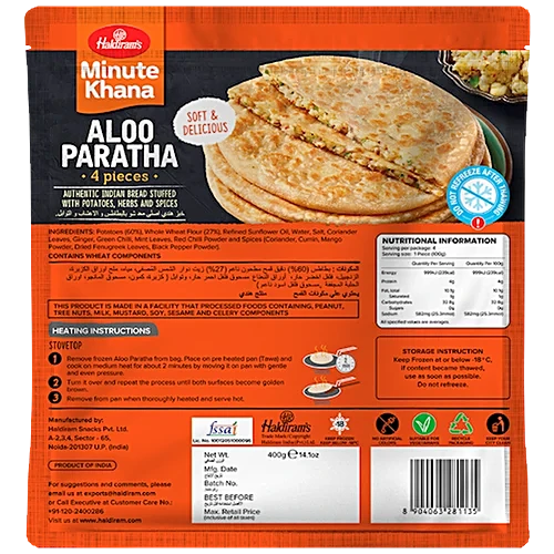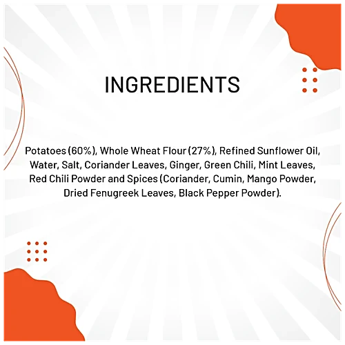 Potato, Wheat Flour, Refines Palmolein Oil, Ginger, Salt, Lemon Juice, Green Chilli, Edible Vegetable Fat, Mixed Spices, Coriander Leaves, Mint Leaves, Cumin Seeds, Black Salt, Red Chilli, Sugar, Fennel Seed, Coriander Seeds & Garlic. Contains Wheat & Mustard Seeds. May Contain Tree Nut & Milk.