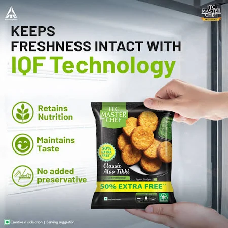 ndulge in the delectable flavours of Delhi's beloved street food with ITC Master Chef's Classic Aloo Tikki. This ready-to-cook frozen snack offers the perfect balance of crispiness and softness, making every bite a tantalizing experience. Crafted with premium quality potatoes and seasoned with a blend of aromatic spices including garlic and red chilies, these flavourful patties are a true culinary delight. Whether you're hosting a gathering, craving a quick snack, or simply want to enjoy the taste of authentic street food, these frozen Aloo Tikkis are a convenient and versatile choice. Prepared in minutes through shallow frying, deep frying, air frying, or baking, they can be enjoyed on their own with chutney, wrapped in a roll, or as a delicious Aloo Tikki chaat. Preserving the taste and nutritional goodness through IQF (Individually Quick Frozen) technology, these preservative-free snacks are made with the highest quality standards to delight your taste buds.