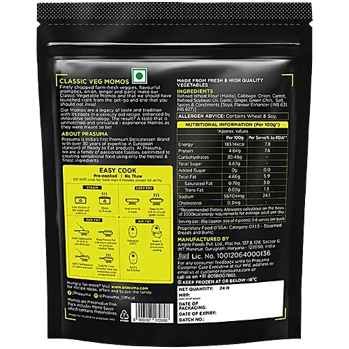 Indulge in the authentic taste of Prasuma Classic Veg Momos, a delectable fusion of farm-fresh veggies, aromatic spices, and a light, fluffy dough. These delicious frozen dumplings are bursting with flavour, offering a perfect balance of taste and texture. Crafted with a thin, delicate wrapper and no preservatives or MSG, these momos make for a convenient and satisfying snack or appetiser. Savour the essence of traditional momos in every bite, as the savoury filling is wrapped in a soft, pillowy exterior. Whether you're a veggie lover or simply craving a comforting, flavourful treat, Prasuma Classic Veg Momos are sure to delight your senses and transport you to the heart of authentic cuisine.
