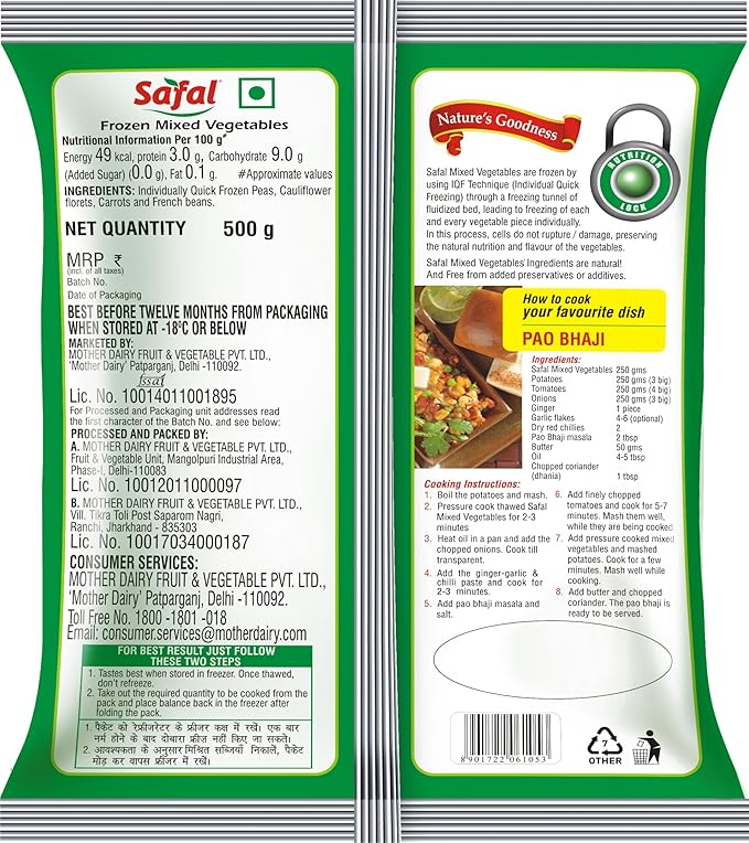 Safal frozen mixed vegetables come in peeled and cut. It contains cauliflower, peas, carrots and beans. These vegetables come from the green fields of north India and are frozen while still fresh using the most advanced individual quick freezing (IQF) technique. This technique helps to conserve the flavor and natural nutrition of the vegetables.