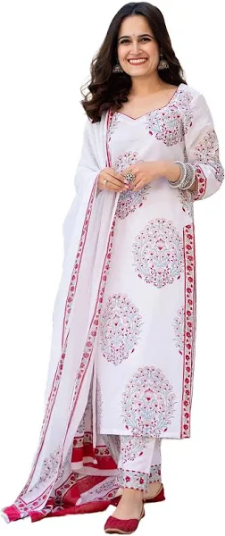 GoSriKi Women's Cotton Blend Floral Printed Straight Kurta with Pants & Dupatta (Cup-Off-White)