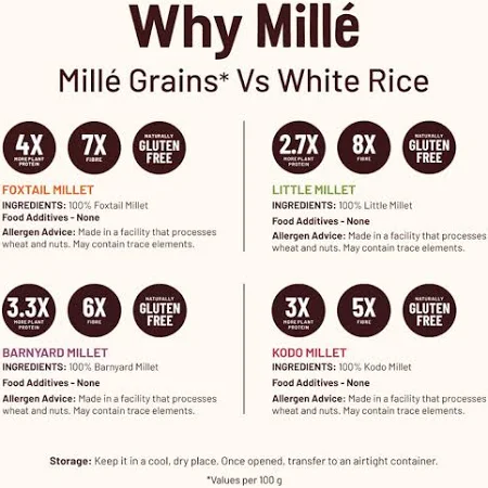From the Makers of Slurrp Farm ❤️ Revamp your diet with Mille’s Millet—a fantastic choice for those seeking a plant protein and fiber-rich, low-carb, and gluten-free option. Millet benefits heart, liver, kidney, and gut health immensely due to the presence of fibre, iron, protein, and low phosphorus High in Fibre and Protein: 5x more fibre and 3x more protein than white rice with lesser carbs