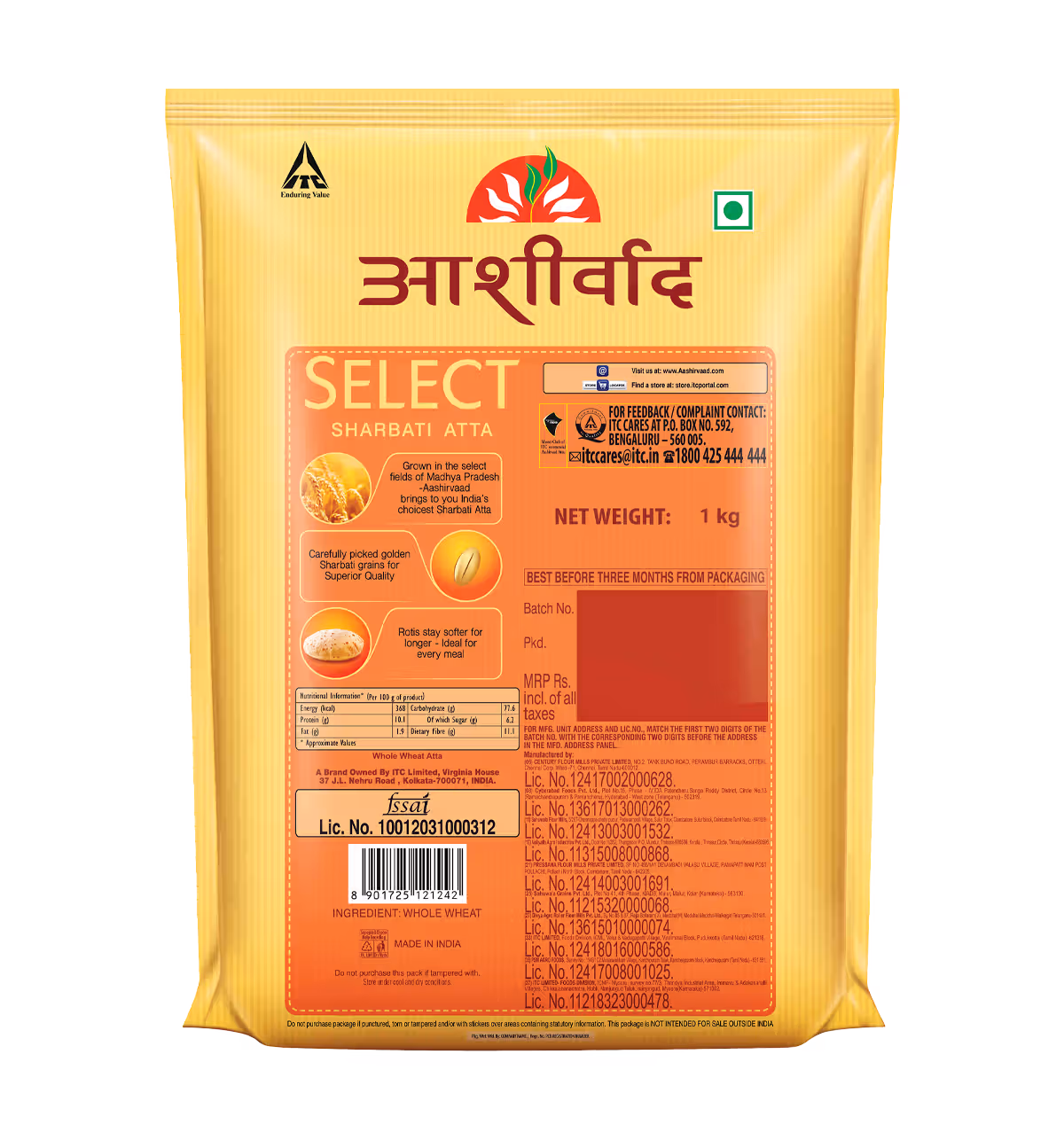Crafted from the regal Sharbati wheat, Aashirvaad Select is India's premium atta, lovingly produced for discerning households. This exceptional flour boasts 100% Sharbati wheat from Madhya Pradesh's finest regions, known for its golden sheen and uniform grain size. Each Sharbati grain has a distinct golden sheen, that makes Select Atta truly special. The sun-kissed fields of MP, blessed with ideal rainfall, yield sharbati wheat atta that absorbs more water, resulting in rotis that are delightfully sweet and irresistibly soft. With Aashirvaad Select, savour softer rotis that maintain their texture longer, bringing the perfect blend of taste and convenience to your dining table.