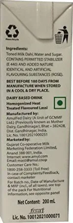 Delicious and nutritious, Amul Lassi (Tetra Pak) is a refreshing milk based drink. Enriched with nutrients, it makes for a healthy and tasty addition to everyday meals. It can be relished anytime of the day and tastes best when served chilled.