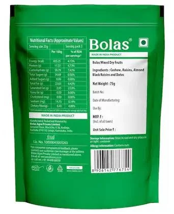 Bolas Mixed Dryfruits 75 g is a delightful assortment of premium-quality dry fruits, carefully selected for their taste and nutrition. This mix includes a balanced blend of almonds, cashews, raisins, and other nutrient-rich dry fruits, making it a perfect snack for health-conscious individuals. Whether as a quick energy boost, a topping for desserts, or an ingredient in your favorite recipes, these dry fruits offer a convenient and tasty way to enjoy natural goodness