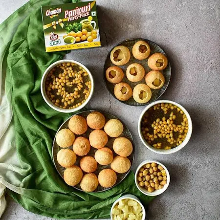 ------------------- Panipuri Masala PackThis Chaman Panipuri Party Pack is perfect for yourol-gappe night just open fry and eat. You don't have to run to streets looking for khatta-meetha paani. Because we'veot you covered there too as the packet comes with your favourite pudina and meetha paani. Empty the packets of pudina and and meetha paani in a large bowl and pour water to mix the mixture properly.Panipuri consists of a round or ball-shaped hollow puri (a deep-fried crisp flatbread) filled with a mixture of flavored water (known as imli pani) tamarind chutney chili powder chaat masala potato mash onion or chickpeas
