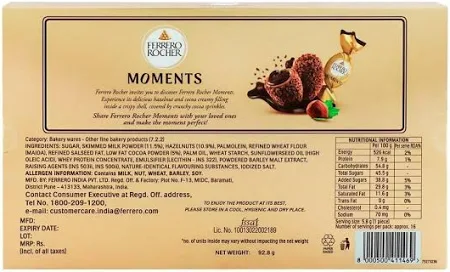 Ferrero Rocher Moments Chocolate 92.8 g, These exquisite treats are carefully crafted to delight your taste buds, offering the perfect balance of crunch and cream in every bite. This luxurious combination is enveloped in a velvety layer of chocolate that adds a delightful sweetness to the overall experience. The result is a bite sized indulgence that's perfect for any occasion. These Chocolates are more than just confections; they are a symphony of taste and texture that invites you to savor the moment. Whether you enjoy them as a personal treat, share them with friends and family, or give them as a thoughtful gift, these chocolates are a perfect embodiment of the pleasure of fine chocolate craftsmanship