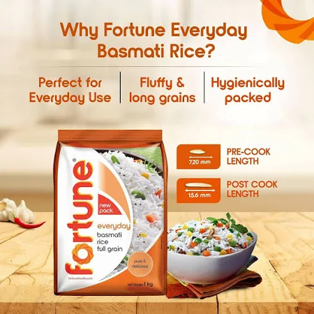 Fortune Everyday basmati rice is a fine variety of basmati that you can relish every day. Specially aged to help every grain of basmati become long and fluffy. On cooking, the grains do not stick together and become flavorsome. The result is an irresistible serving of basmati that delights everyone’s heart through its appearance and taste.