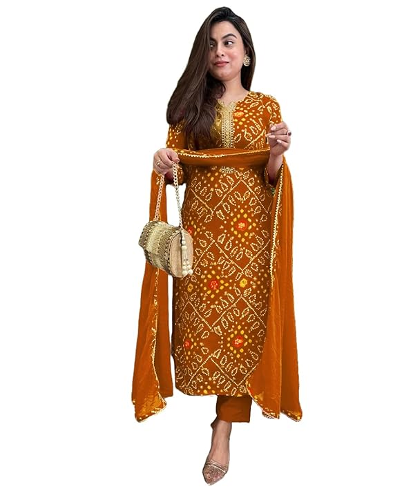 Kurta Set Fabric: Rayon Blend || Kurta Set Color :- Red Style: Straight || Length: Calf Length || Sleeves: 3/4 Sleeves || Size Chart- Kurta-S-36 in, M-38 in , L-40 in , XL-42 in , XXL-44 in,Pant :- S-28 in, M-30 in , L-32 in, XL- 34 in , XXL- 36 in,For More Please refer to the size Chart below. This set includes: 1 Kurta and 1 Pant with Dupatta || Work :- Bandhani Printed || Neck Style:- Round Neck Colour Declaration : There might be slight variation in the actual color of the product due to different screen resolutions. Ocassion: Traditional wear, Casual Wear, party wear, evening wear,Please Click On Brand Name "GoSriKi" For More Products.