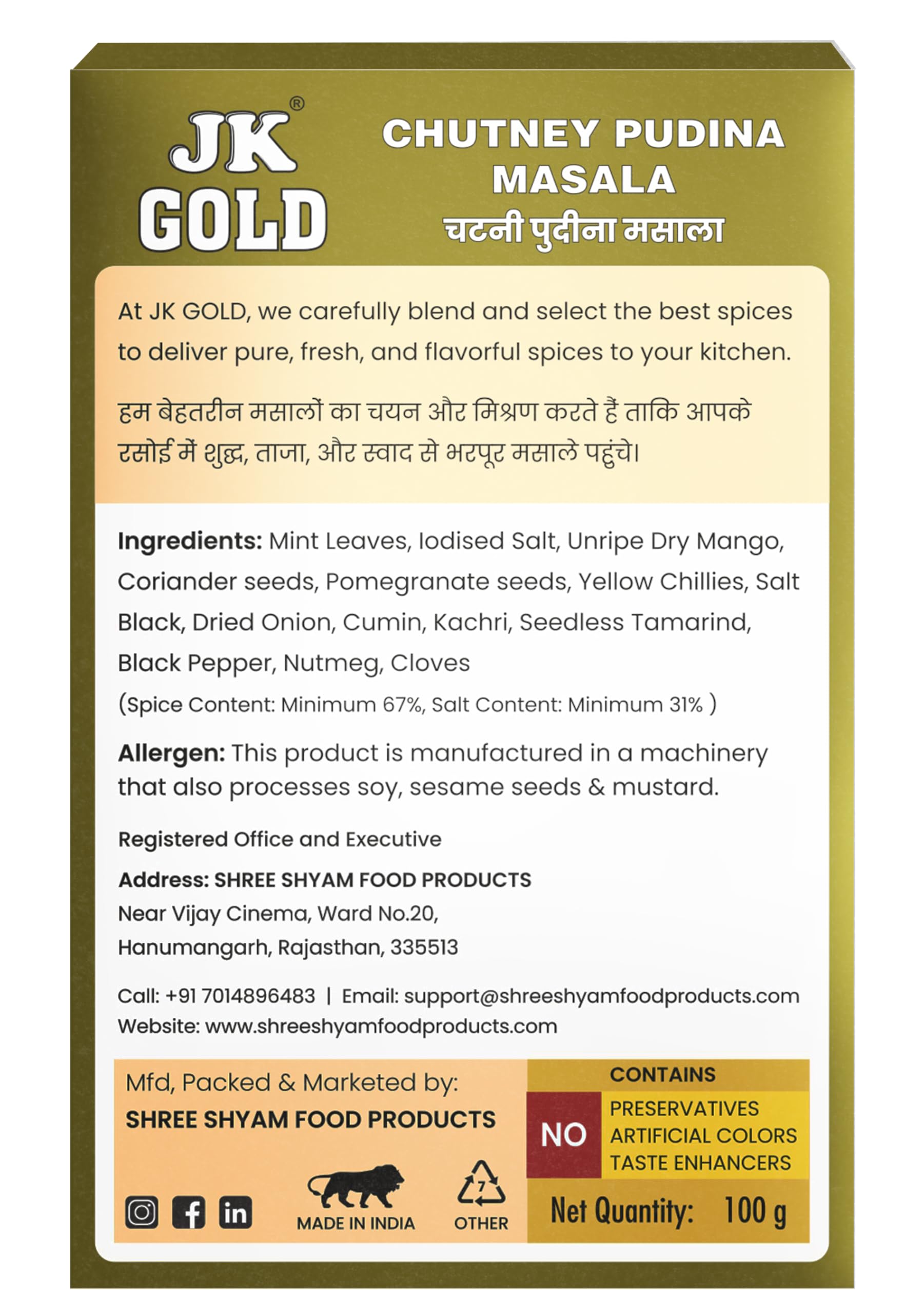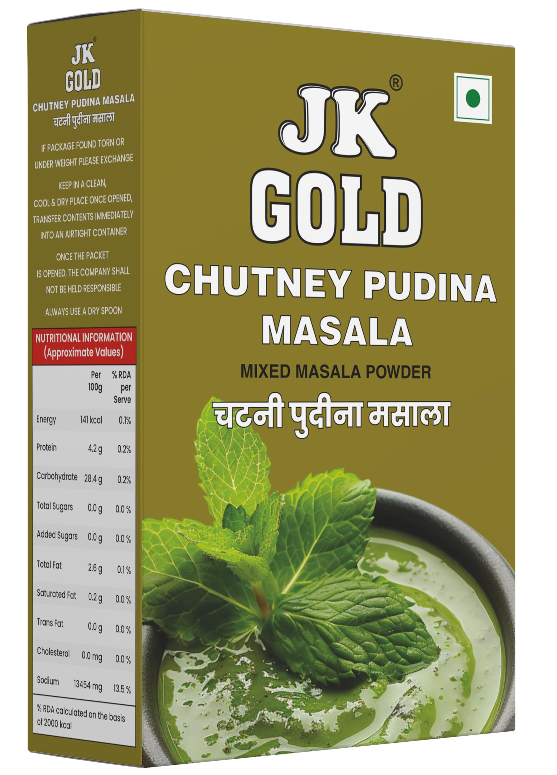Crafted to deliver the refreshing and aromatic taste of mint, typical of traditional Indian chutneys. Ideal for preparing mint chutneys, enhancing dips, salads, and sandwiches with a zesty minty kick. Contains a balanced mix of dried mint leaves, cumin, black salt, and other spices. Contains no added color or preservatives, ensuring a natural taste. Comes in a 100g pack, ideal for regular use in home kitchens.