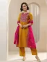 Get festive-ready with this mustard kurta set from Libas. Crafted from silk blend, this gorgeous set features three fourth sleeves and a round neck. Team it with a pair of heels and statement jewellery.