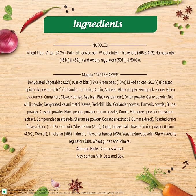 Your favourite MAGGI noodles now loaded with goodness of whole wheat A brand-new masala taste made using 20 herbs and roasted spices A source of iron and fibre, MAGGI nutritious and delicious Easy to cook, MAGGI atta noodles take just 3 minutes