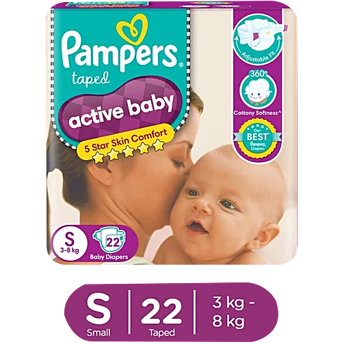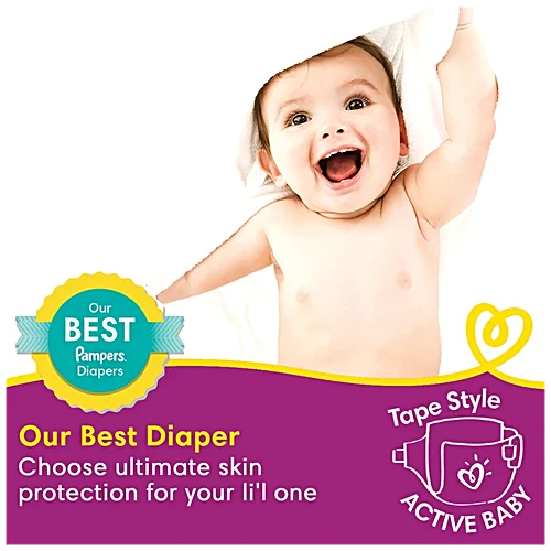 Pampers Active Baby taped diapers provide your baby with 5-star skin protection. The adjustable taped fit can be custom-fitted to your baby's needs, and the stretchable sides and waist offer 360-degree cottony softness for ultimate comfort. The extra dry layer helps prevent leakage by evenly spreading the baby's urine, while Pampers' unique magic gel technology absorbs the baby's pee for up to 12 hours. These are Pampers' best taped diapers ever, trusted by mothers and doctors.