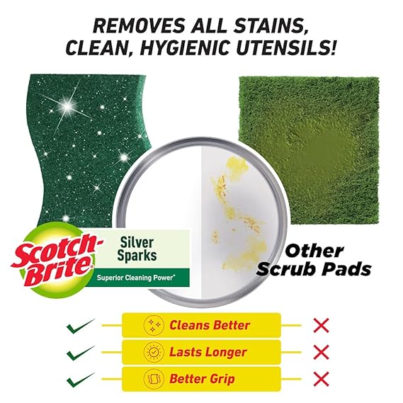 New and differentiated product Has silver particles which gives extra cutting power The abrasive particles are evenly distributed through the scrub pad which ensure that it cleans better for longer Increased thickness Flexible structure which ensure that the scrubber can clean all nooks and corners