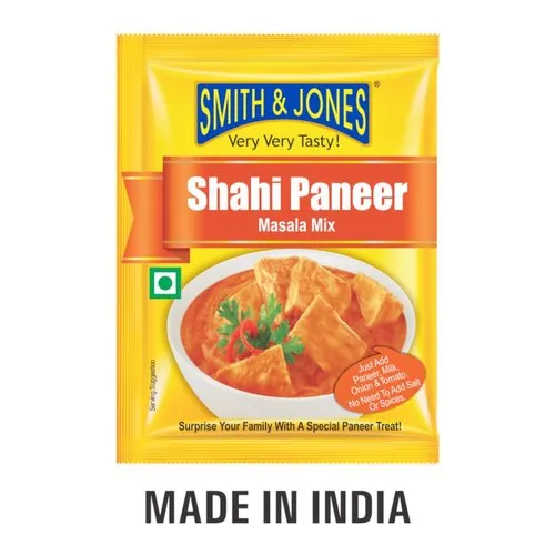 Smith & Jones Shahi Panner Masala Mix is blend of selected spices. It contains spices like cumin and cinnamon, coriander, cardamom, anistar, fennel and many more. This enhances the flavour and aroma of the shahi panner. It helps you prepare delicious and tasty dish. This mix gives the dish a great texture and is flavourful. It does not contain any added preservatives and no artificial colours.