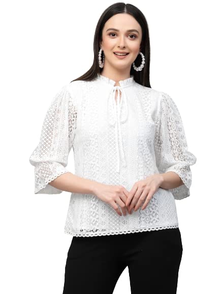 Style Quotient Women Self Design Lace Regular Smart Casual tops Can be worn at party event or a casual day out Cotton Nylon Lace, Wrinkle Resistance, Light weight, Durable And comfortable White lace tops with three quarter puff sleeves with flared hem, tie up high neck with frill detailing on the neckline and straight bottom hem with lining attached