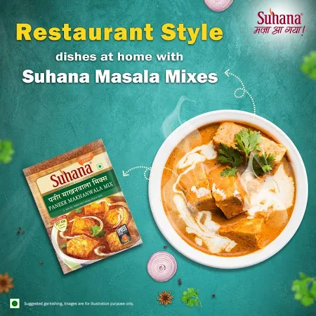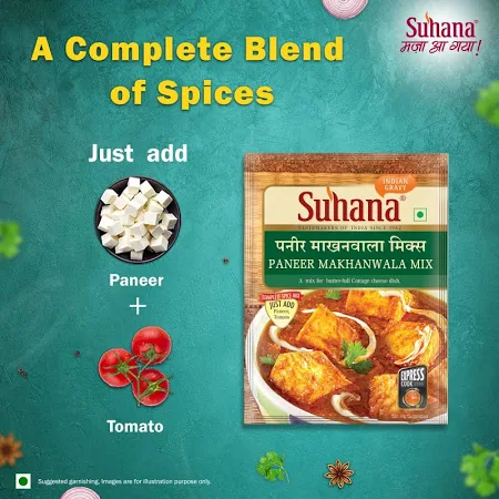 No added MSG, no artificial flavours, no added colours & preservatives Lip-smacking taste, super convenient & cooks in minutes Low Temperature Grinding so that the spices retains its Freshness and Aroma. Reduce cooking preparation time by using Suhana spice mixes range Use 'Suhana Paneer Makhanwala' to create a truly memorable meal! Each Pack Serves 4