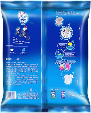 Surf excel Easy Wash has the power of 10 hands that removes tough stains easily;It’s a superfine powder that dissolves easily and removes tough stains fast It's superior technology fights various tough stains such oil, ketchup, chocolate, curry stains; For tough stains, pre-soak you garments in Surf excel Easy Wash solution for 30 mins Hand-wash - Use 2 scoops of Surf excel Easy Wash, Machine-wash - Use 3 scoops of Surf excel Easy Wash
