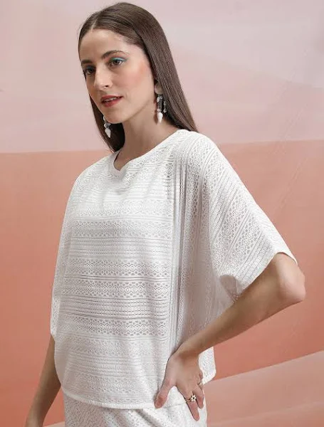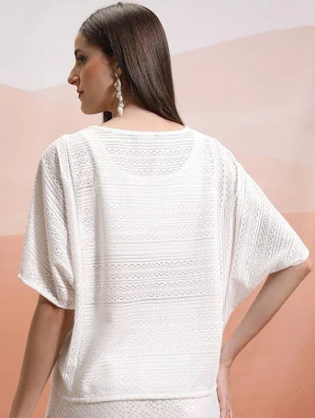 White regular top Self design Round neck, short, batwing sleeve Detail Woven Closure Cotton