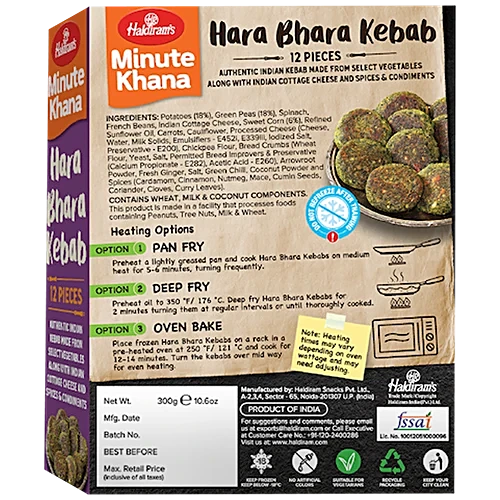 haldiram hara bhara kabab is a delicious vegetarian delight , featuring patties made from a wholesome blend of spianch ,potatoes ,and green peas .there spiced kababs are pan-fried and infused with aromatic herbs, offering a flavorful and satisfying snack or appetizer .as part of the