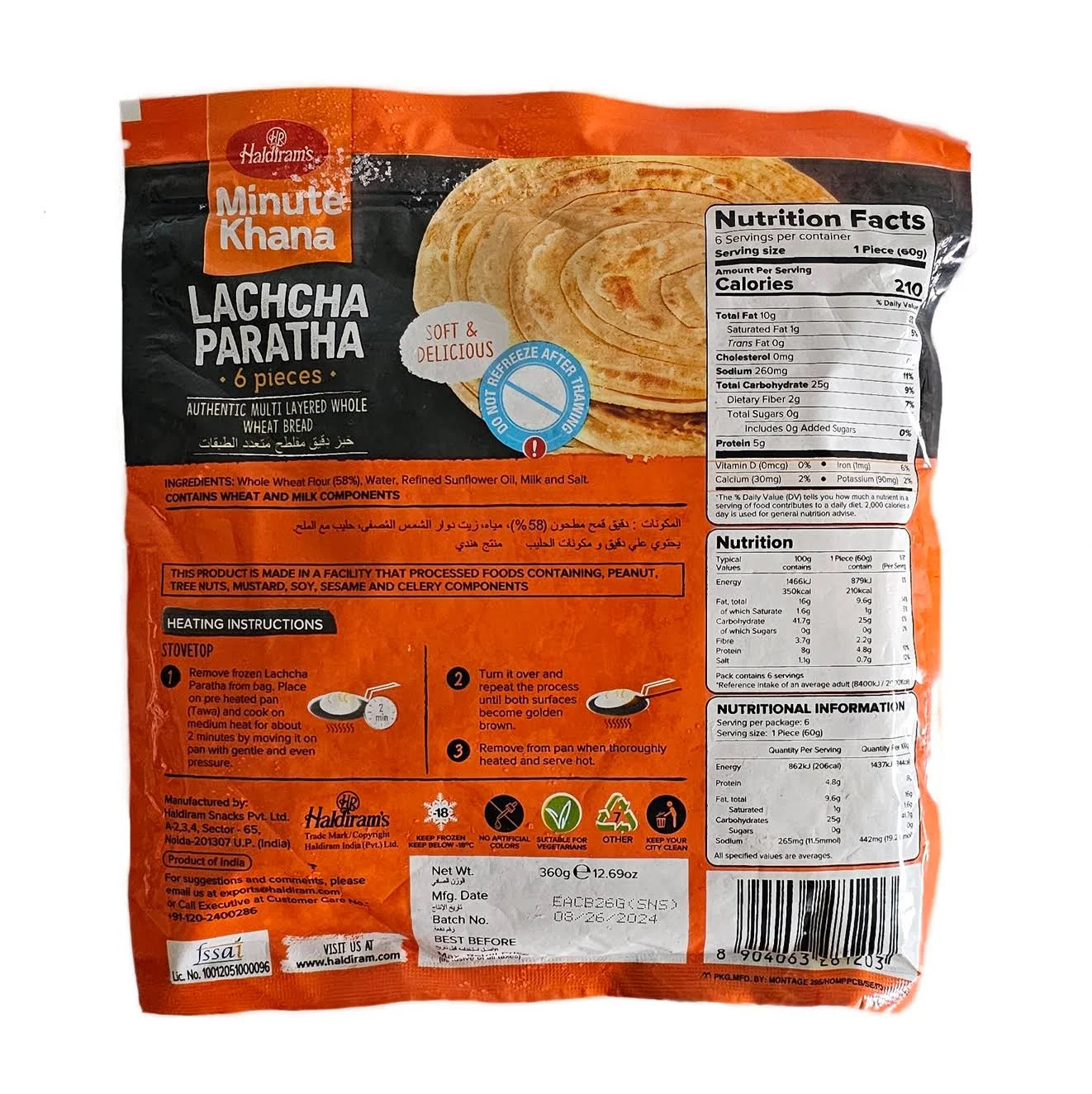 Haldiram's Lachha Paratha 360g is a frozen, ready-to-eat Indian flatbread with a flaky, layered texture, available in both plain and masala varieties. A 360g pack typically contains six individual parathas.