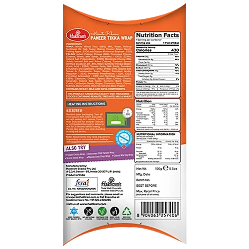 TheHaldiram's Paneer Tikka Wrapis available in a 156g pack andfeatures a filling of paneer tikka, spices, and cheese wrapped in a whole wheat flatbread. It is part of the "Minute Khana" line of frozen snacks and can be reheated quickly for a meal or snack.