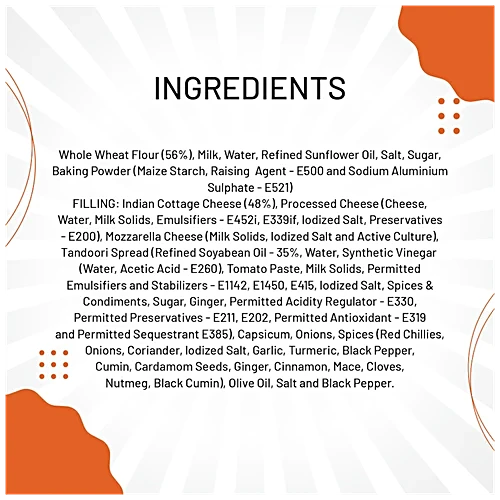 Cheesy filling: The filling includes a blend of Indian cottage cheese (paneer), processed cheese, mozzarella cheese, and a tandoori spread for a creamy texture.