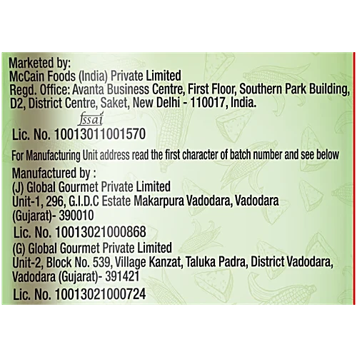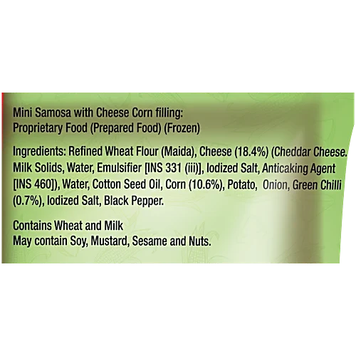 A frozen 240g pack ofcheese corn samosasis available fromMcCain, a popular brand for frozen snacks. The product is a mini version, containing bite-sized samosas with a creamy cheese and sweet corn filling.