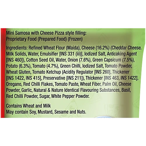 Indulge in the ultimate snacking experience with McCain's 'Cheese Pizza Style Filling' Mini Samosas. The crispy outer shell and a mouthwatering combination of melted cheese and savory pizza toppings inside are perfect for satisfying your cravings any time of day!