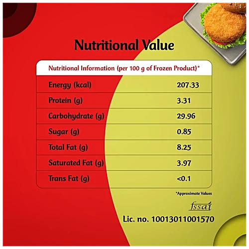 •  contains six patties made from a blend of vegetables and mashed potatoes, coated in crispy breadcrumbs. The frozen patties can be prepared quickly by deep-frying, baking, or air-frying.