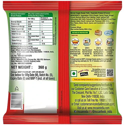 McCain Veggie Burger Patty is a popular, frozen, ready-to-cook vegetarian patty designed for quick meals and homemade burgers. Basket of Frozen Basket of Frozen +1 Key Features & Highlights: Ingredients: A blend of potatoes (approx. 45-53%), mixed vegetables like carrots, green peas, and sweet corn, coated in crunchy breadcrumbs. Texture & Taste: Crispy on the outside, soft and savory on the inside. Preparation: Easy to cook in 3–4 minutes via deep frying, shallow frying, or air frying directly from the freezer—no thawing required. Usage: Ideal for burger fillings, snacks, or appetizers served with dips/ketchup. Storage: Keep frozen at -18°C or below. abuu.in +8 Common Pack Sizes: 360g: Contains approximately 6-7 patties. 400g: Standard retail pack. 1.2kg: Popular for, or larger households. Basket of Frozen Basket of Frozen +4 Nutrition (Approx. per 100g): Energy: ~190-210 kcal Fat: ~7-9g Protein: ~3-4g Carbs: ~27-30g McCain India McCain India +2